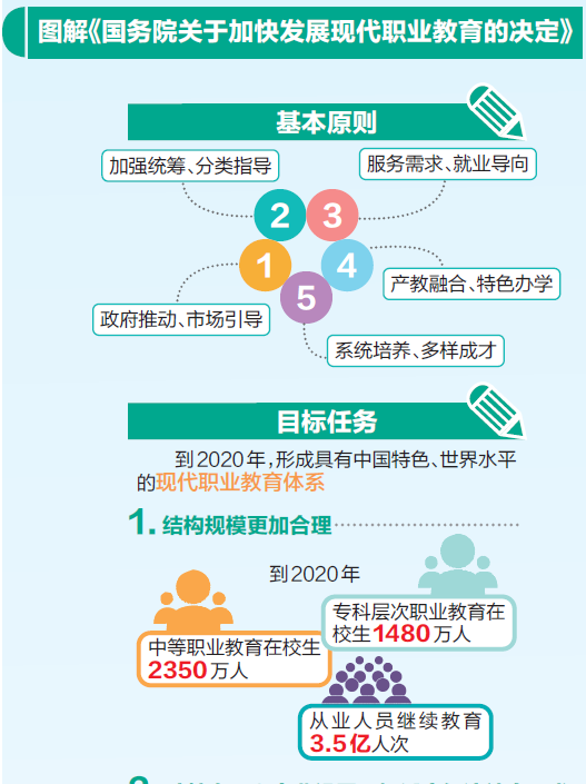 2014年6月,習(xí)近平總書(shū)記對(duì)職業(yè)教育作出重要指示,強(qiáng)調(diào)要“高度重視、加快發(fā)展”。國(guó)務(wù)院召開(kāi)全國(guó)職業(yè)教育工作會(huì)議,印發(fā)《關(guān)于加快發(fā)展現(xiàn)代職業(yè)教育的決定》,提出以培養(yǎng)技術(shù)技能人才為目標(biāo),到2020年形成具有“中國(guó)特色、世界水平”的現(xiàn)代職業(yè)教育體系。