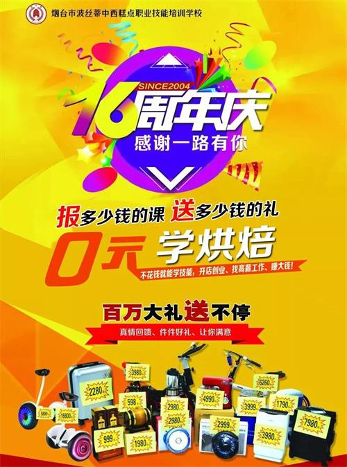 煙臺市波絲蒂中西糕點職業技能培訓學校創立于2004年,是中西糕點專業培訓機構,是煙臺市人力資源和社會保障局指定的正規技能培訓基地。西點課程設置全面:面包專科班、蛋糕專科班、休閑干點班、月餅專科班、披薩專科班、裱花專科班、法式甜品專科班、韓式裱花班、休閑飲品咖啡班、健康日式面包提升班、私房創業綜合班、業余西點流行班等等。