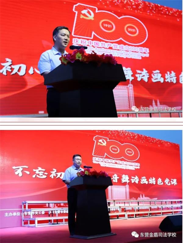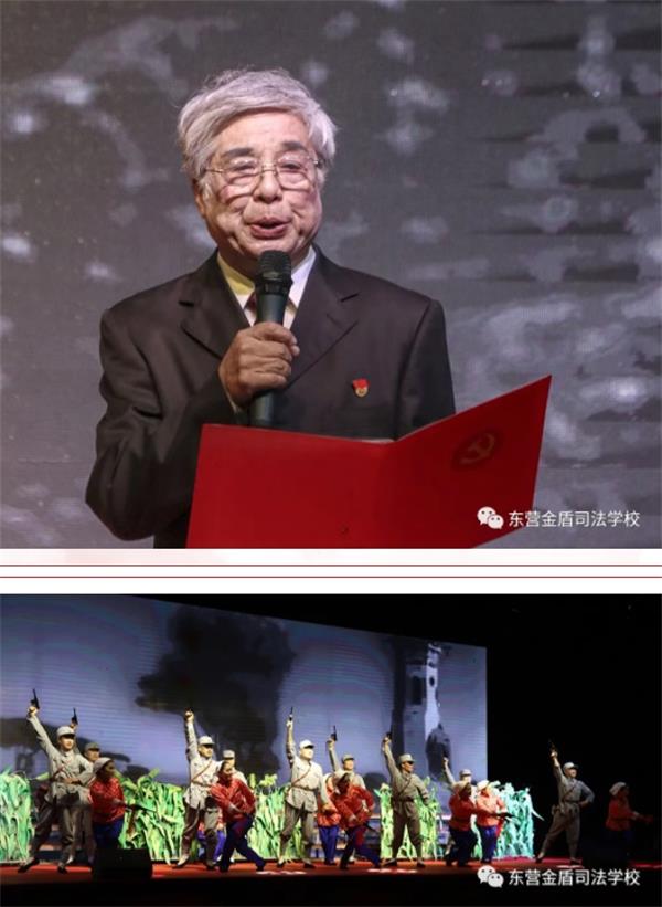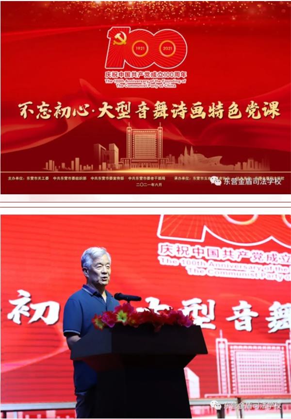 崢嶸歲月共見證,百年華誕譜新篇。6月8日晚,東營市“五老”志愿者協會藝術團“不忘初心”大型音舞詩畫特色黨課在東營金盾司法學校開講。本次“特色黨課進校園”活動由東營市關工委、中共東營市委組織部、中共東營市委宣傳部、中共東營市委老干部局主辦;東營市“五老”志愿者協會承辦;中共東營區六戶鎮黨委、鎮人民政府,東營金盾司法學校協辦。市關工委常務副主任、市“五老”志愿者協會會長張秀香,市“五老”志愿者協會副會長王春愛、孫三民、劉秀清、王培林、宋國謙、蓋金香,市司法局黨組書記、局長鄭少峰,區委組織部副部長李廣明,區關工委主任趙冪,副主任張偉民,區教育局黨組副書記、副局長高玉明等領導參加了活動。六戶鎮黨委書記曲建仿,鎮長劉國強帶領鎮委鎮政府全體干部職工和轄區內各村委書記、黨員代表以及全校1500余名師生也參加了本次活動。