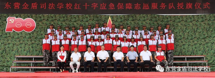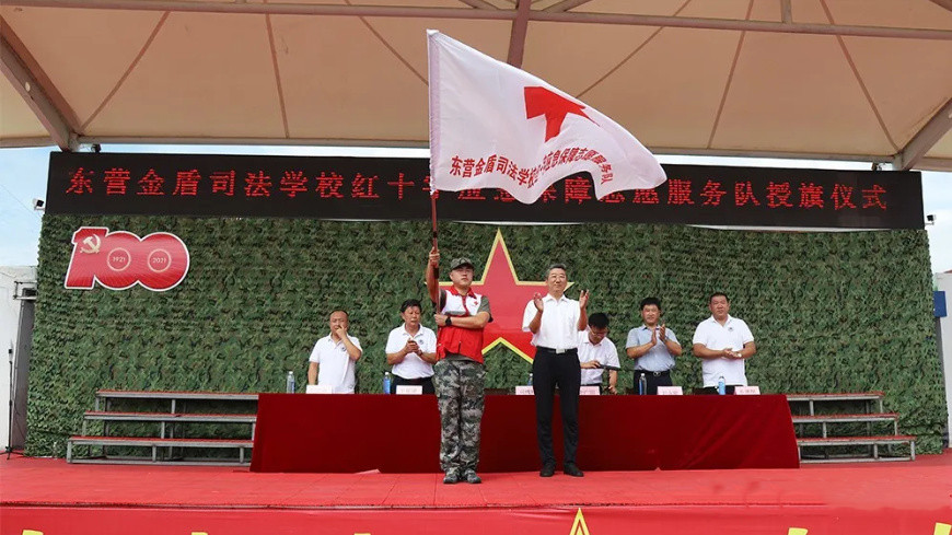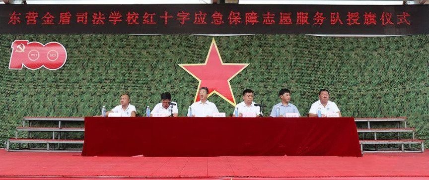 為發揚紅十字會人道、博愛、奉獻精神,支持人道救援救助愛心行動,2021年7月27日上午,東營市紅十字會為東營金盾司法學校紅十字應急保障志愿服務隊舉行授旗儀式。東營市紅十字會黨組書記、常務副會長司傳珍、市紅十字會業務科科長劉永新、學校副校長王周河、劉文政、孔德朋及200余名志愿者參加了授旗儀式。儀式由副校長史廣國主持。