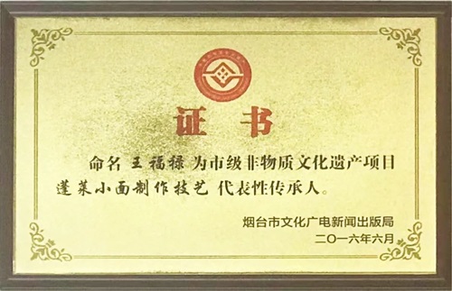 王福祿——山東省非物質文化遺產·蓬萊小面?zhèn)鞒腥?/span>、中國魯菜烹飪大師、國家級酒家酒店評審員、山東省道德模范。王福祿16歲開始學藝,對蓬萊小面的制作技藝有獨特的感情。40年如一日,潛心研究蓬萊小面的歷史文化,遍訪當地小面名家,收集整理蓬萊小面在各個地區(qū)的發(fā)展狀況,吸取眾家技藝精華,融合發(fā)展,推陳出新。先后推出八仙面系列、一窩絲系列等新品。在傳承人王福祿先生的帶領下,蓬萊小面的技藝傳承發(fā)展、聲譽傳播發(fā)揚,非物質文化遺產的保護挖掘都達到了一個新的高度。