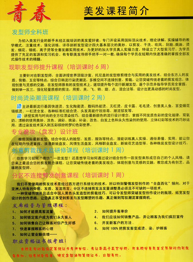 聊城青春美容美發(fā)藝術(shù)學(xué)校自1992年創(chuàng)辦至今一貫秉承嚴(yán)謹(jǐn)教學(xué)、因材施教、學(xué)以致用的辦學(xué)宗旨。所有課程均由國(guó)家級(jí)美發(fā)技師,國(guó)家級(jí)高級(jí)美容、美發(fā)、化妝、保健、足療師執(zhí)教,采用互動(dòng)式教育。開(kāi)啟學(xué)習(xí)的潛能以聽(tīng)、看、練、想、問(wèn)的基礎(chǔ)方法,配以大型專業(yè)實(shí)習(xí)店面,免費(fèi)對(duì)外開(kāi)放,供學(xué)員真人真店,實(shí)練操作。確保每位學(xué)員都能熟練掌握專業(yè)技術(shù)。為保證教學(xué)質(zhì)量給學(xué)員一個(gè)真實(shí)的承諾,本校特與每位學(xué)員簽約教學(xué),一次交費(fèi)學(xué)會(huì)為止,免費(fèi)進(jìn)修,畢業(yè)后經(jīng)考核成績(jī)合格者頒發(fā)“中華人民共和國(guó)技術(shù)等級(jí)資格證書”,免費(fèi)安排就業(yè),月薪500-1500元。