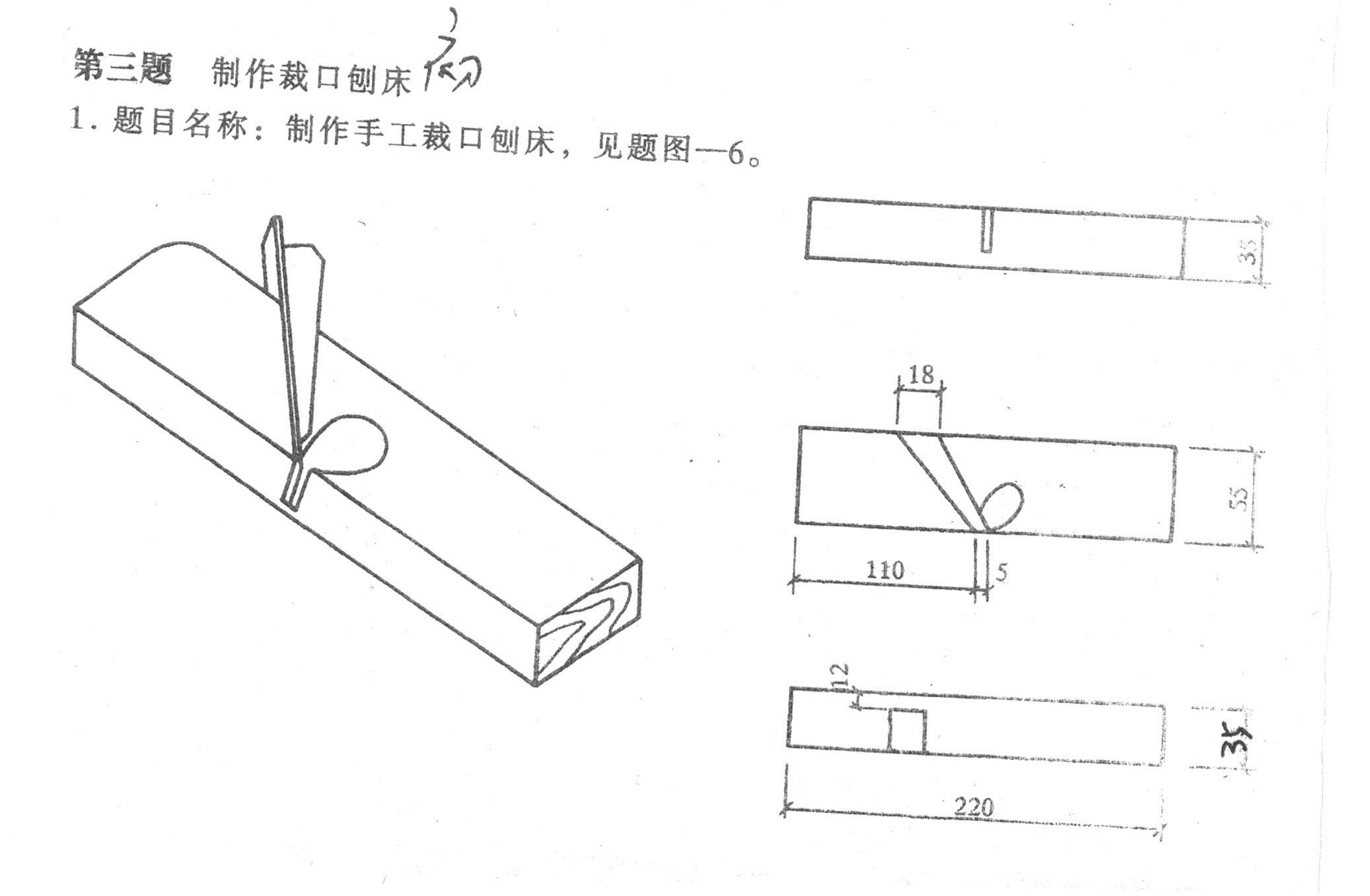 (2)題目內容 依據考生提供的材料和簡單的圖示及給定的刨刃尺寸,操作者應在限定的時間內,熟練地完成各道工序,獨立完成裁口刨床的制作,并當場利用制成的裁口刨示范,嚴整使用效果。