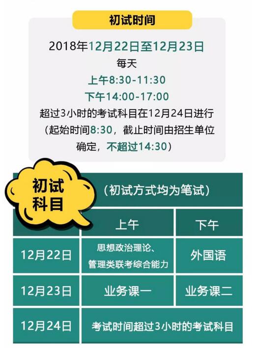 2019年全國碩士研究生招生考試初試時間為2018年12月22日至12月23日(每天上午8:30-11:30,下午14:00-17:00)。超過3小時的考試科目在12月24日進行(起始時間8:30,截止時間由招生單位確定,不超過14:30)。