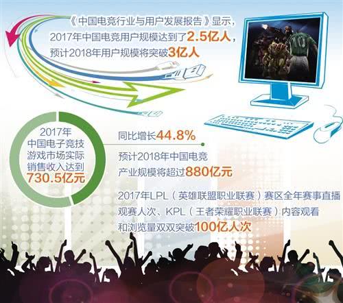 來自市場研究機構伽馬數據的研究報告顯示,2017年中國電子競技游戲市場實際銷售收入達到730.5億元,同比增長44.8%,預計2018年中國電競產業規模將超過880億元。