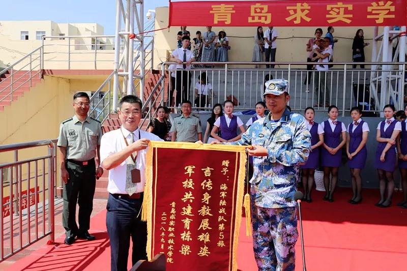青島警備區原司令員王傳友、青島市政協教科文衛體委員會齊光輝、青島市司法局原局長鄭可悌、青島市委高校工委原副書記梁永東、青島市城陽區政協副主席張玉良、青島市委統戰部調研員黃慶新、海軍陸戰隊某旅參謀周新剛、青島海昌達機電有限公司董事長趙炳民、青島海奕醫療器械有限公司總經理鄭廣鵬等領導受邀參加典禮,與學院董事長林夕寶、黨委書記蘆憲英、院長張光興、學院院級領導、二級分院院長、行政部門負責人在主席臺共同觀看了2018級新生軍訓會操。
