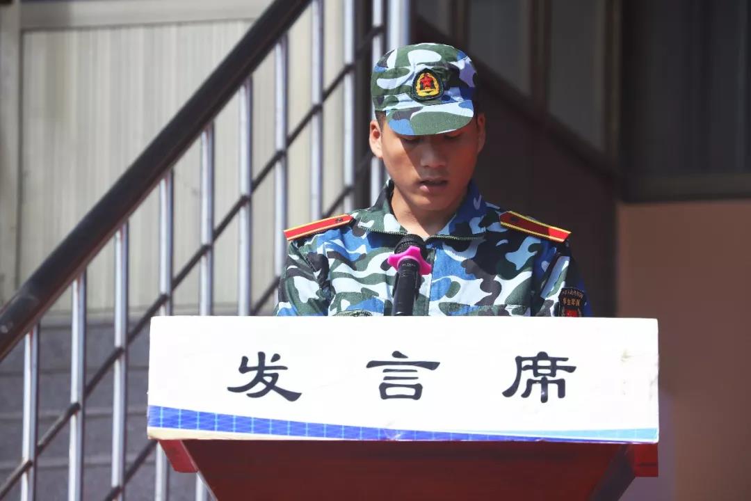 2018級新生代表高哲發(fā)言,他向全體新生發(fā)出倡議,在軍訓期間端正態(tài)度,嚴于律己,磨練意志,鍛煉自我,共同努力圓滿交上軍訓這份答卷。