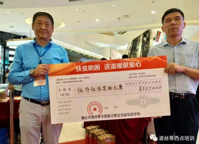 義賣會(huì)上,煙臺(tái)市波絲蒂中西糕點(diǎn)職業(yè)技能培訓(xùn)學(xué)校將“波絲蒂杯”西點(diǎn)創(chuàng)新大賽45件作品累計(jì)拍得善款5570元,全部捐贈(zèng)給萊陽(yáng)市馮格莊街道中小埠村,用于扶貧工作,感謝各位選手的付出和社會(huì)相關(guān)愛心捐贈(zèng)人士的參與,特別感謝拍出一等獎(jiǎng)蛋糕(現(xiàn)金2000元)的獲得者,煙臺(tái)葡緹芬生物科技有限公司大力支持。