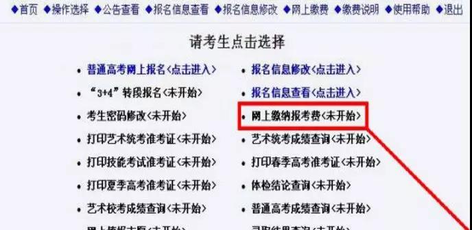 點擊右側(cè)中間“考生點擊此處開始網(wǎng)上繳費”打開考生操作選擇頁面: