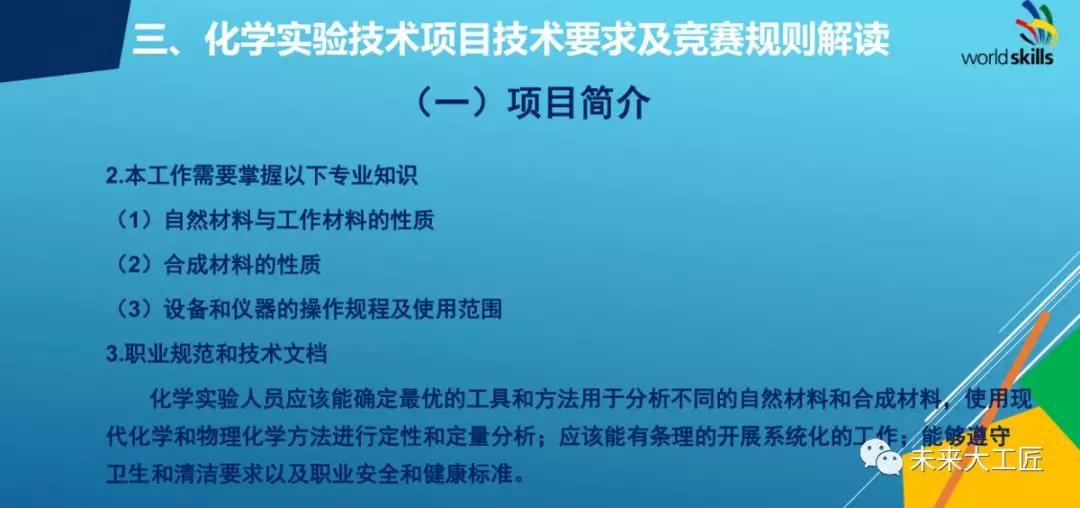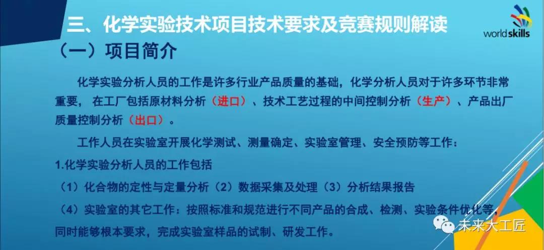 據悉,化學實驗室技術項目為第45屆世界技能大賽新增項目,本次比賽吸引了來自全省14家單位的28名選手參與。正式比賽時間為12月25日,技術點評、成績公布時間為26日。比賽結束后,第一名選手將代表我省出戰第45屆世賽化學實驗室技術全國選拔賽。