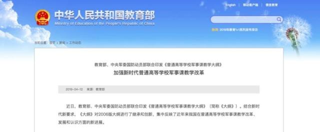 據(jù)教育部官網(wǎng)4月12日發(fā)布的消息,近日,教育部、中央軍委國防動員部聯(lián)合印發(fā)《普通高等學(xué)校軍事課教學(xué)大綱》(簡稱《大綱》)。結(jié)合新時代新要求,《大綱》對2006版大綱進(jìn)行了繼承和創(chuàng)新,集中反映了近年來我國在普通高等學(xué)校軍事課教學(xué)改革、發(fā)展和認(rèn)識方面的新進(jìn)展。