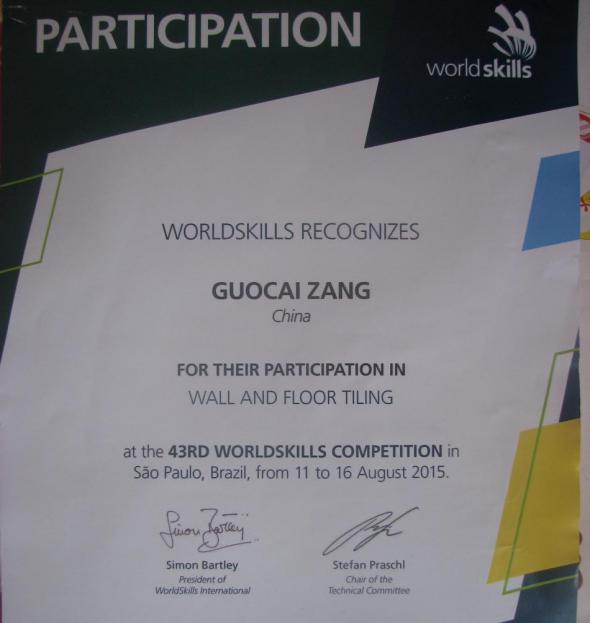 臧國才是由我校培養、在我校成長壯大并服務于我校職業技能教育領域的優秀人才。2010 年在我校建筑工程技術專業學習,多次參加各種級別職業技能競賽,取得全國第一 3 個,2015 年 4 月,國家人社部組織參加新西蘭大洋洲技能挑戰賽,獲得瓷磚貼面項目金牌。2015 年 8 月,參加巴西舉辦的第 43 屆世界技能大賽,獲得瓷磚貼面項目優勝獎。畢業后,拒絕外省的高薪聘請,毅然決然留校執教,6 年來,為我市培養高技能人次百余人次,很多都已經成為行業的佼佼者。