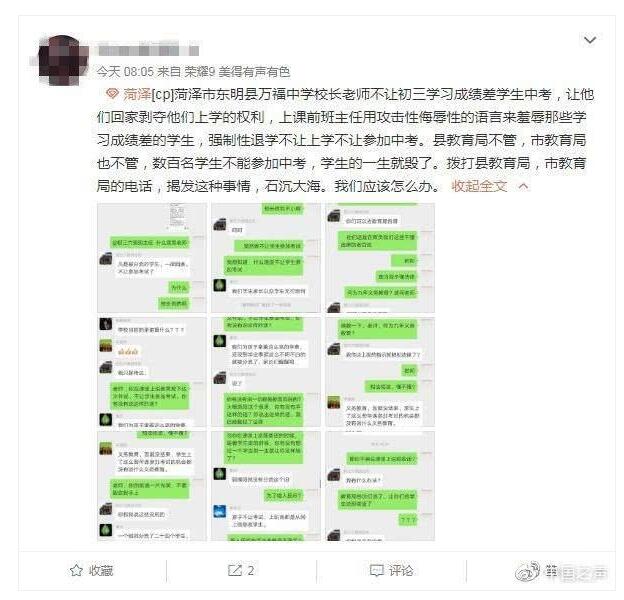 據中國之聲報道:近日,山東菏澤市東明縣的學生家長向媒體爆料稱,當地萬福中學有初三學生因為成績差被禁止參加中考,家長懷疑這是校方為保障升學率而進行的強制“分流”。