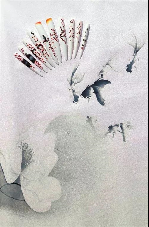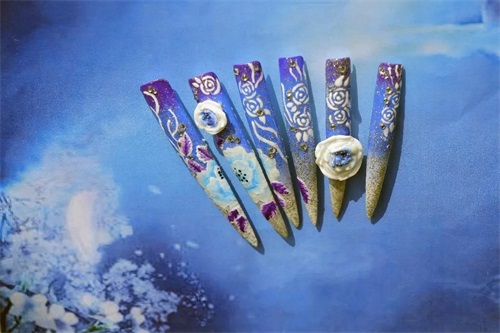 主題創(chuàng)意美甲作品是同學們根據(jù)即定的主題,在沙龍甲片上用手繪、漸變、暈染等美甲技法完成整體創(chuàng)意美甲作品。同學們手繪背景圖片或者用歐根紗小珍珠等材料裝飾,把自己的美甲作品裝裱在相框內,使作品主題清晰明了,同時也增添了技能大賽豐富多彩的形式。