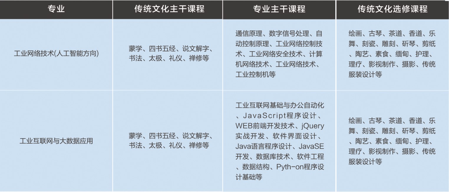 學生入校以后,傳統文化和專業課程、社會實踐、單位實習相結合。所有學生學習并力行中華優秀傳統文化,成為既精通專業技術,又深諳傳統文化義理,還具有國家認可的學歷,德才兼備的現代國學復合型人才。開設專業:工業網絡技術(人工智能方向)、工業互聯網與大數據應用。