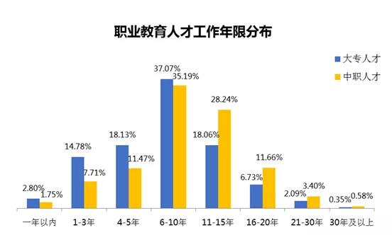 職業教育人才的薪酬數據顯示,2018年以來,大專人才的薪酬水平較為平穩,當前為7227元/月,僅同比增長0.12%;中等職業教育人才的薪酬水平雖然較大專人群低1500元左右,但近兩年增勢較好,當前為5888元/月,同比提升4.32%。職業教育人才的薪酬水平與全國平均水平相比雖然存在一定差距,但也在合理范圍內,并且基于當前國內就業市場上職業教育人才緊缺的現狀,職業教育人才的薪資待遇未來上漲空間較為可觀。