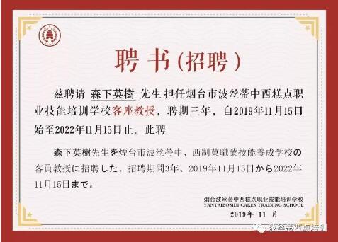 近日,日本烘焙大師森下英樹先生受聘成為煙臺波絲蒂西點培訓學校的客座教授,聘期三年,學校舉行了聘任儀式,陳紅林校長為森下先生頒發了聘書。