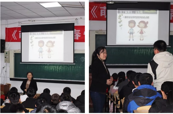 通過與學(xué)生互動(dòng)的方式,讓學(xué)生說出關(guān)于愛情的理解,之后邢老師總結(jié)出什么是愛情,愛情的真諦是什么。是集合了激情、親密和承諾的愛情,才是真正的愛情。邢老師通過斯滕伯格的愛情觀,讓同學(xué)們理解處在這個(gè)年紀(jì)得到的不是真正愛情,要正確對(duì)待自己與異性的關(guān)系。最后,邢老師通過幾個(gè)小故事,講解了如何正確對(duì)待青春期早戀問題,如何正確的與異性交往。