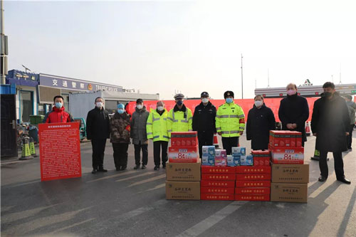 2月5日上午,德州交通職業中等專業學校向德州南高速檢測點、德州市經濟開發區綜合執法監管部環衛處捐贈價值5萬元的物資。物資包括1200只日本援助口罩、4箱84消毒液、10箱豆奶粉、80個水杯、20箱蘋果。