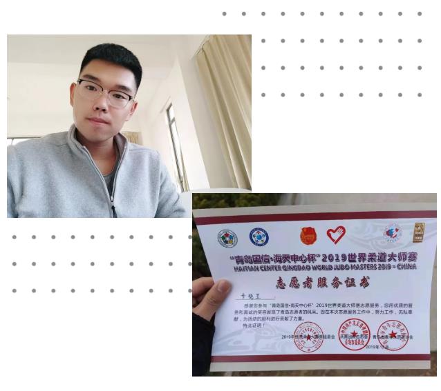在大學期間,我在班級中擔任團支書一職,對待工作能夠認真負責;在開學初積極遞交了入黨申請書;現任青島理工大學琴島學院青年志愿者聯合會干事,并獲得“優秀干事”稱號;在2019年12月,通過學院面試選拔,參加“2019世界柔道大師賽”的志愿服務工作,并獲榮譽證書。