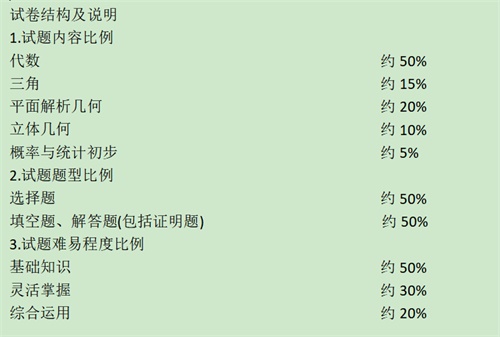 考試內容包括代數、三角、平面解析幾何、立體幾何、概率與統計初步五部分。考試中允許使用函數型計算器。推薦使用CASIO fx-82CNX函數型計算器、北雁牌CZ-1206H函數型計算器。