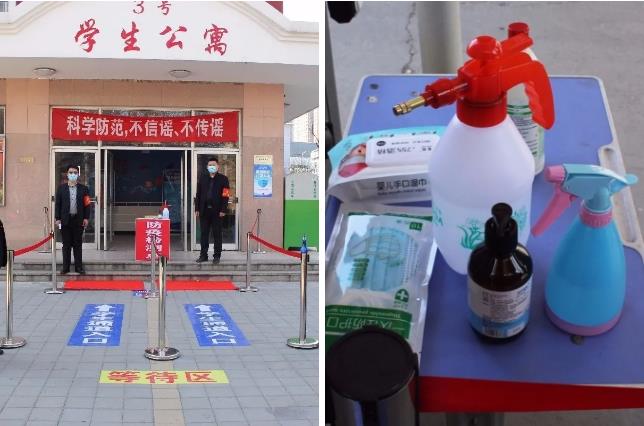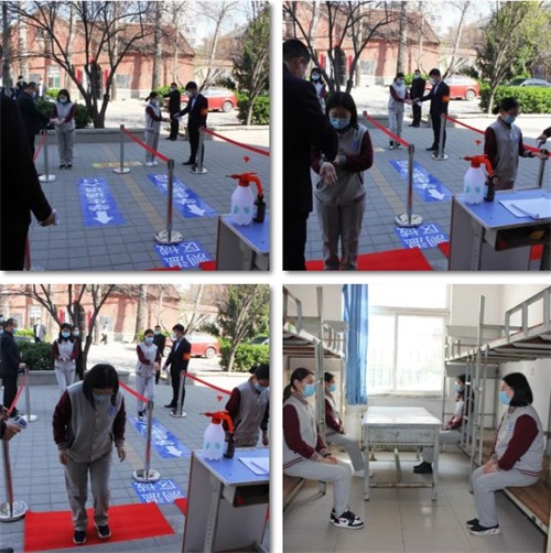 學生來到宿舍,有序排隊進行體溫檢測,鞋底消毒。進入宿舍后,保持距離,減少交流。