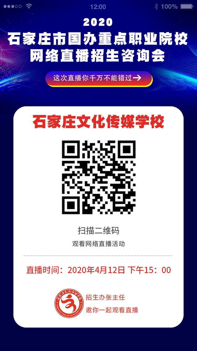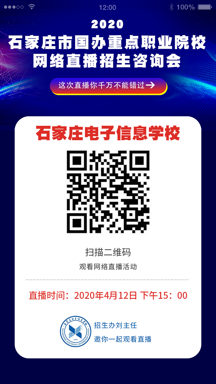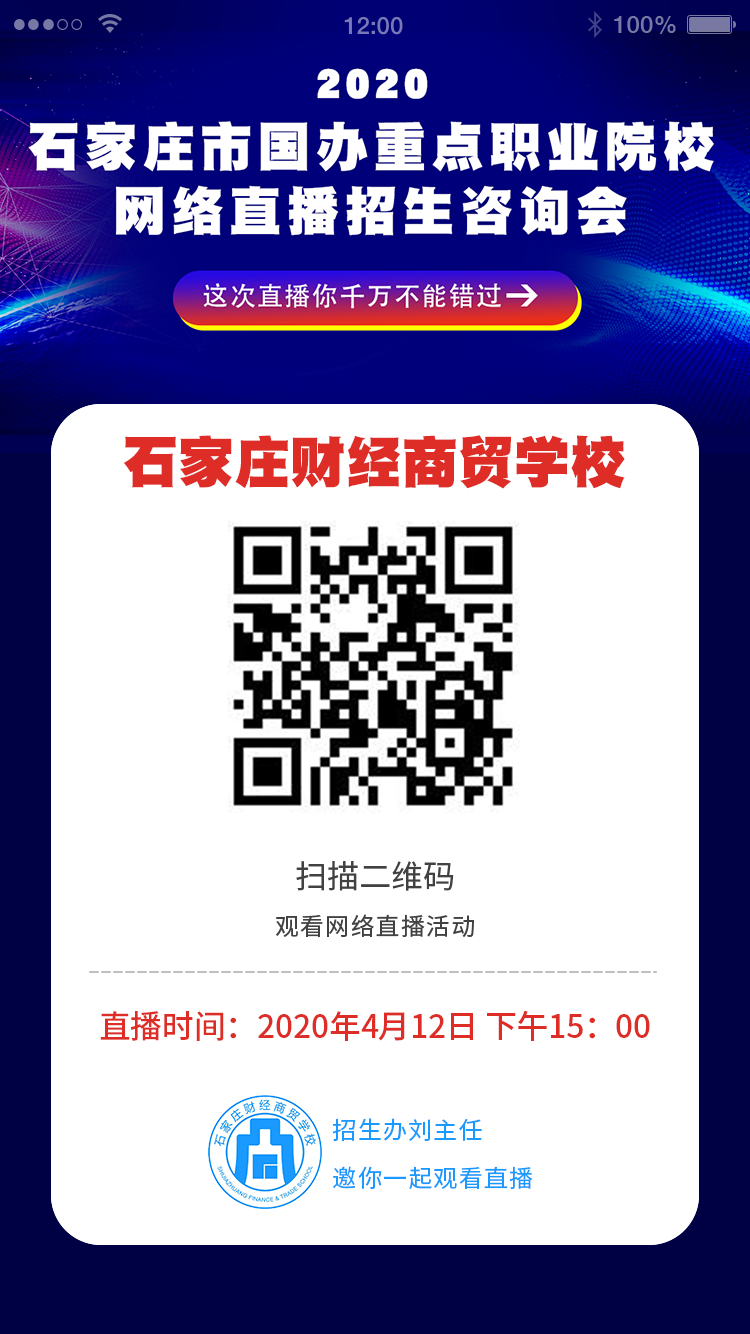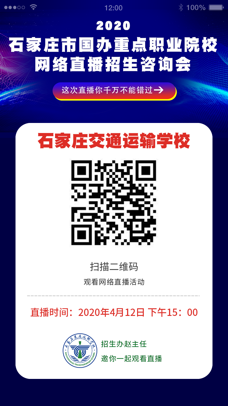 為幫助2020屆初三學(xué)子們了解到職業(yè)院校權(quán)威招考資訊,職教網(wǎng)聯(lián)合多所國辦重點(diǎn)職業(yè)院校共同舉辦的"2020年石家莊市國辦重點(diǎn)職業(yè)院校網(wǎng)絡(luò)直播招生咨詢會(huì)"公益直播活動(dòng),第一場將于4月12日下午15:00舉行;顒(dòng)邀請首批四所國辦學(xué)校的招生辦負(fù)責(zé)人以直播形式,為學(xué)生答疑解惑!