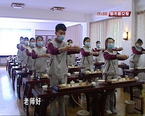 電視臺記者首先來到濟南應用技術職業中等專業學校的茶藝室,課堂上,師生問好改成了行作揖禮。不光是課上,下課之后同學、老師相遇,也是用作揖禮打招呼。