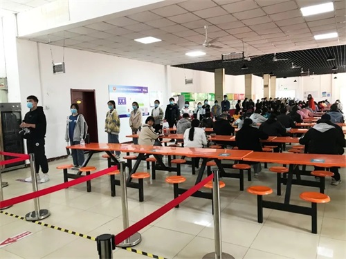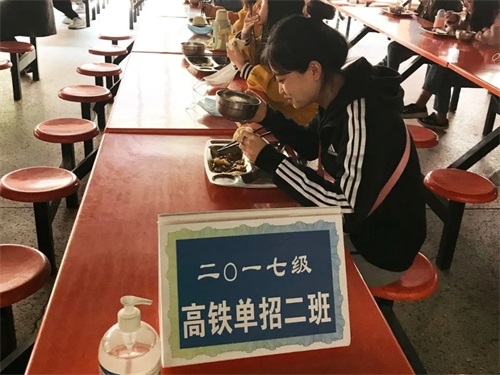 學生在教室門口集合,以班為單位排成兩隊且間隔1米以上,分時段、分批次在班主任的帶領下有序前往餐廳。按照就餐指示牌,依次取餐,學生就餐時,嚴格按照標簽的張貼位置,單人單桌,間隔1米以上同方向就餐。