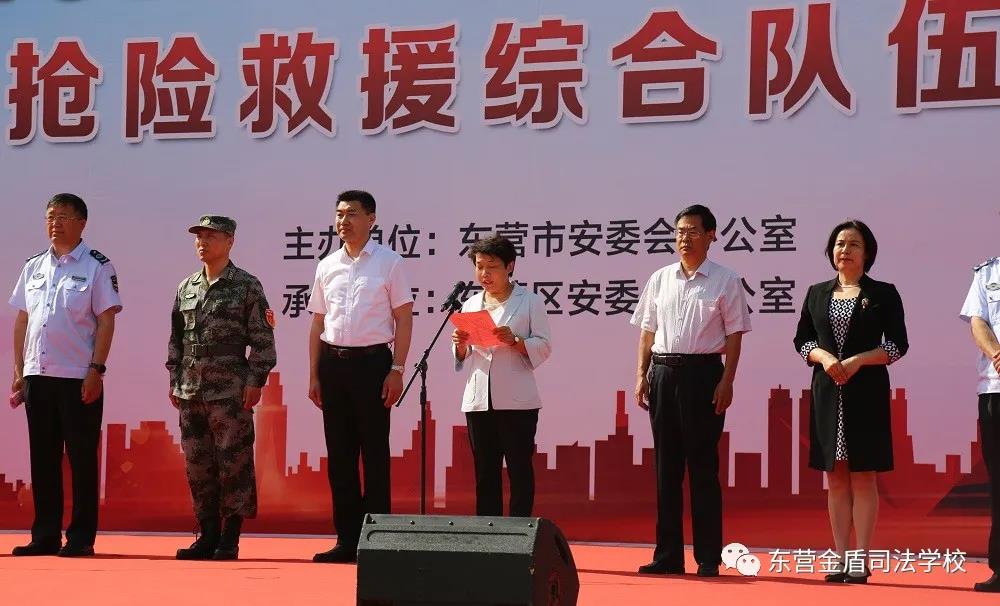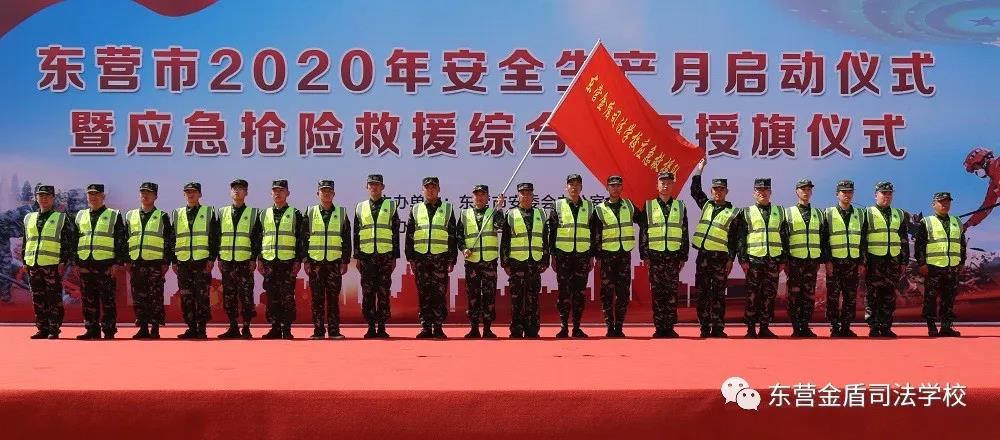 為進一步推動新時代文明城市建設,真正建立起一支訓練有素、指揮科學、反應迅速、戰斗力強的應急救援服務隊伍,6月3日上午,東營市舉行2020年安全生產月啟動儀式暨應急搶險救援綜合隊伍授旗儀式,東營市市委常委、東營軍分區司令員邊志偉,東營市副市長、公安局局長戚思宇、東營區委副書記、區長燕雪英等領導出席大會,大會由東營市政府副秘書長、市應急管理局黨委書記、局長劉良范主持。山東東營金盾司法學校志愿者應急救援服務隊及東營市兄弟救援服務隊和部分企業、社區群眾參加了此次活動。