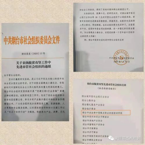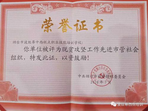 山東技校網 >> 菁菁校園 >> 助力煙臺市脫貧攻堅工作,煙臺波絲蒂中西糕點職業技能培訓學校受到表揚!