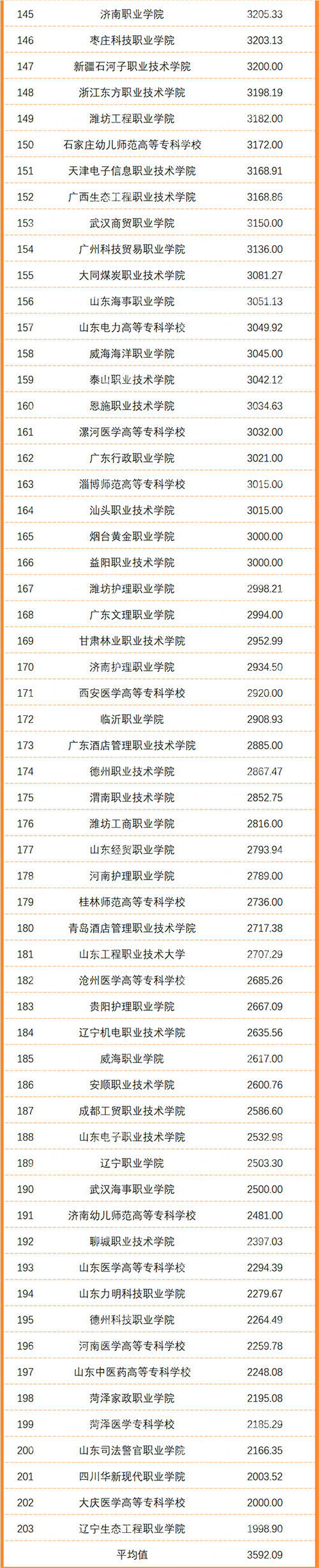 經數據統計可以看出,全國203所高職院校的平均工資為3592.09元,其中月收入高的達到了6217.5元,超出平均值2625.41元。其中有2所“雙高”院校,分別是深圳職業技術學院和北京電子科技職業學院,其畢業生月收入為5553元和5400元。