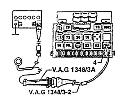 3)把帶有轉(zhuǎn)接線V.A.G1348/3-2的遙控器V.A.G1348/3A接到觸點(diǎn)4和蓄電池正極上,見圖7。