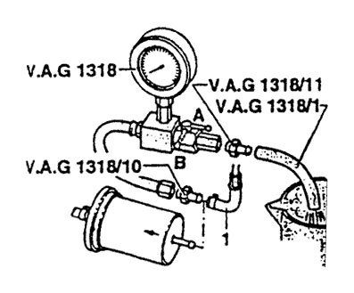 3)把帶有轉接線V.A.G1318/10的壓力測試儀接到燃油管1上,見圖9。