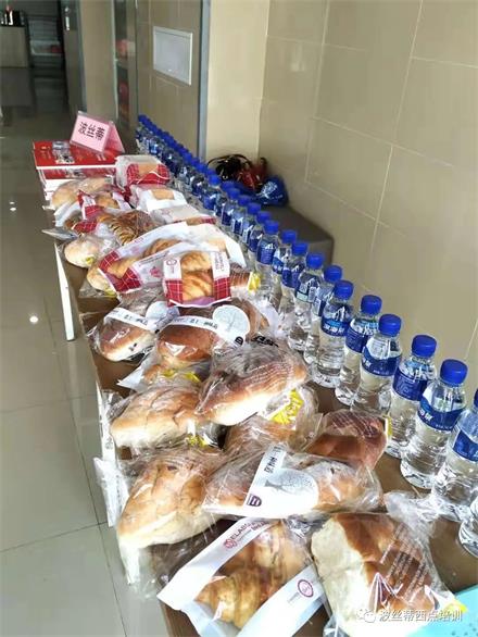 波絲蒂西點培訓學校陳紅林校長、劉君副校長為"愛心驛站"送來面包、礦泉水。