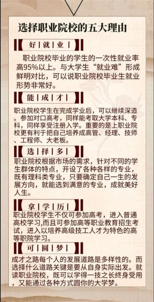 最后,建議各位家長根據學生的實際情況,做出合理的選擇。不管是讀中職還是讀高中,相信家長和學生都有自己的想法,家長都渴望自己孩子都成才,但是成才的方式有很大種,只有選擇適合自己孩子的發展方向才是對的,才能真的獲得成功。