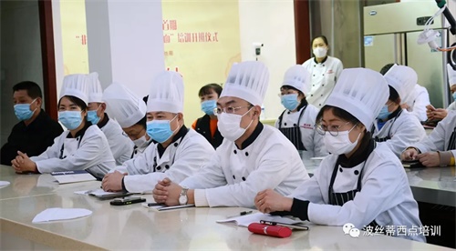 煙臺市芝罘區公共就業和人才服務中心王滋軍副主任(左三)、煙臺市芝罘區公共就業和人才服務中心培訓科邢海英科長(右三)、蓬萊小面傳承人王福祿(左二),中飯協膠東促進委研究院秘書長王惠忠(右二),煙臺市波絲蒂中西糕點職業技能培訓學校校長陳紅林(左一)共同出席了開班儀式。