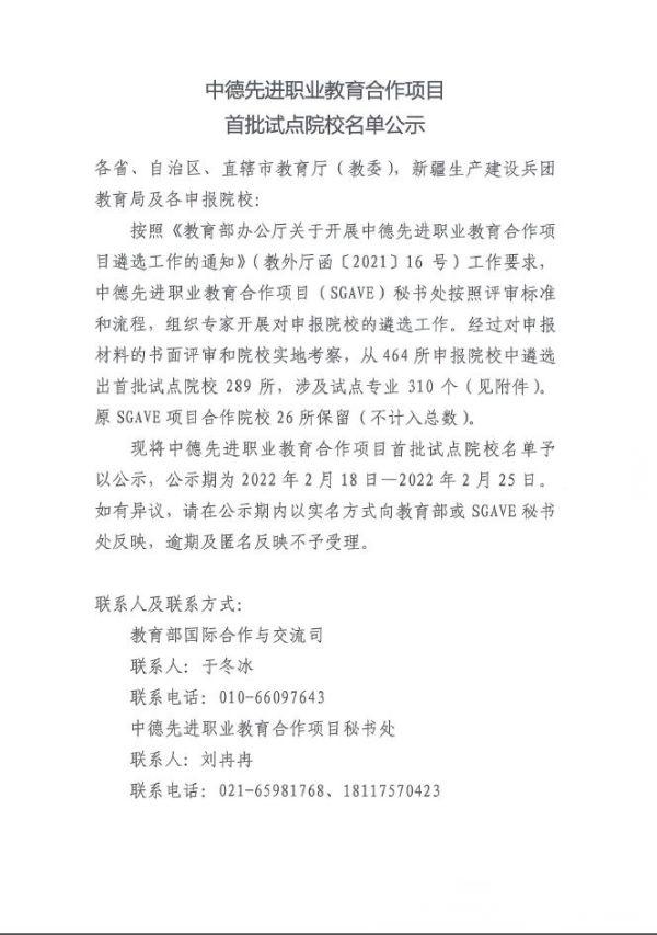 按照《教育部辦公廳關(guān)于開展中德先進(jìn)職業(yè)教育合作項(xiàng)目遴選工作的通知》(教外廳函2021]16號(hào))工作要求,中德先進(jìn)職業(yè)教育合作項(xiàng)目(SGAVE)秘書處按照評(píng)審標(biāo)準(zhǔn)和流程,組織專家開展對(duì)申報(bào)院校的遴選工作。經(jīng)過對(duì)申報(bào)材料的書面評(píng)審和院校實(shí)地考察,從464所申報(bào)院校中遴選出首批試點(diǎn)院校289所,涉及試點(diǎn)專業(yè)310個(gè)。山東省濰坊商業(yè)學(xué)校汽車運(yùn)用與維修專業(yè)入選其中。