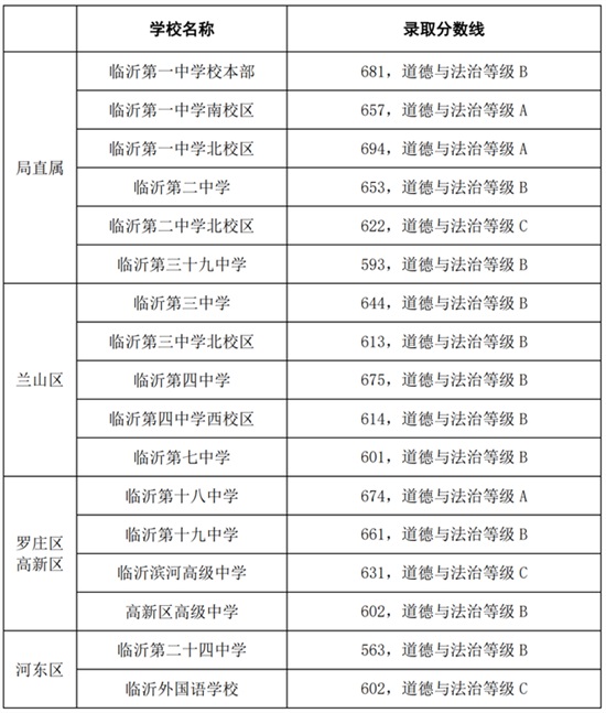 2022年臨沂市城區公辦普通高中學校普通生錄取分數線