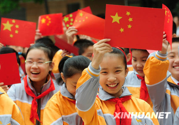 9月1日,在安徽省合肥市安慶路第三小學,學生們舞動自制的國旗,迎接新學期的到來。