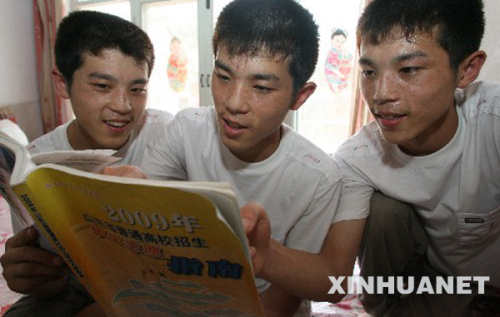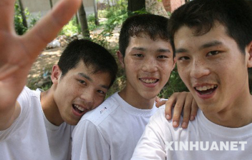 2009年6月30日 山東高密三胞胎兄弟高考考出“連號分” 三兄弟今年19歲,2006年同時考入高密市鳳城中學(xué),為了便于區(qū)分,學(xué)校把他們分在不同的班級,在今年的高考中他們都取得了優(yōu)異的成績,老大凌霄618分、老二凌漢616分、老三凌云617分,比山東理科一本錄取分?jǐn)?shù)線高出30多分。 新華社發(fā)(曹亮華 攝)