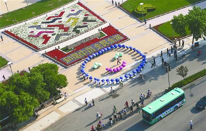 圖為用雨傘組成的卡通笑臉“綻放”在泉城廣場。