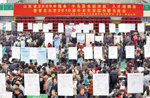 昨天,山東省2009年服務“半島藍色經濟區”人才招聘暨青島大學2010屆畢業生首屆供需見面洽談會在青島大學體育館舉行,來自半島藍色經濟區的420余家用人單位,為兩萬多名畢業生提供了1.1萬個工作崗位。