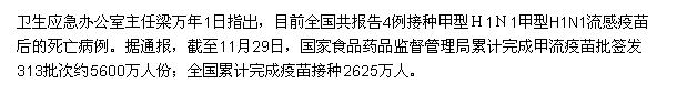 據(jù)通報(bào),截至11月29日,國(guó)家食品藥品監(jiān)督管理局累計(jì)完成甲流疫苗批簽發(fā)313批次約5600萬(wàn)人份;全國(guó)累計(jì)完成疫苗接種2625萬(wàn)人。