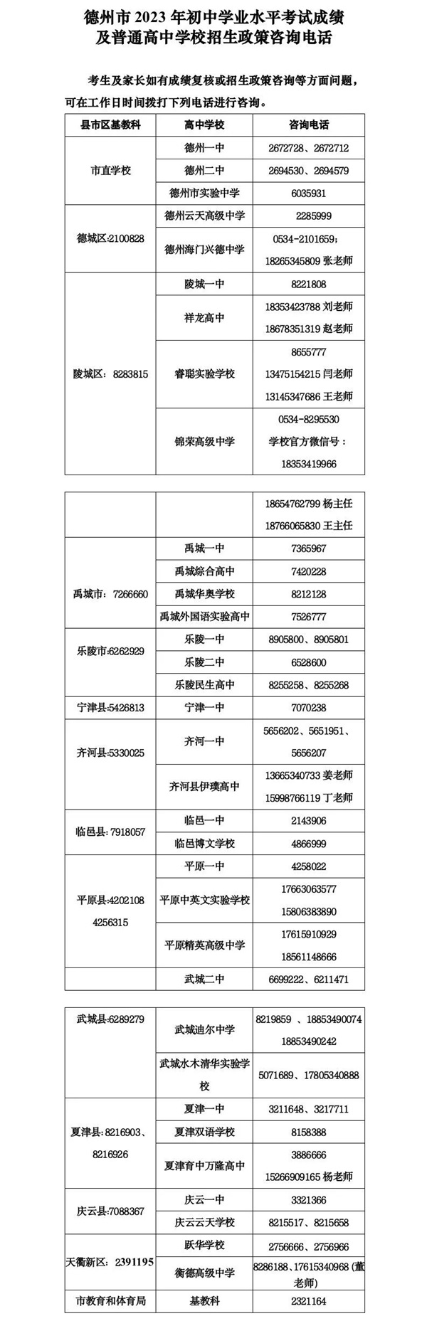 附件1:德州市2023年初中學業水平考試成績及普通高中學校招生政策咨詢電話