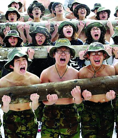 近日,在韓國首爾附近,參加軍訓的學生們赤膊在雪地中搬起木樁。約300名大中小學學生參加這個由韓國退役海軍陸戰隊員指導的冬訓營,參訓時間從3天至14天不等,以提高身心耐力。