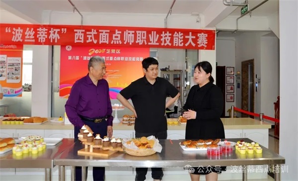 煙臺市芝罘區人社局職建科負責人李楠(右一)、波絲蒂培訓學校副校長陳聰(中)、煙臺面點大師王惠忠(左一)在競賽現場