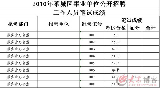 在帖子附帶的名為“2010年萊城區(qū)事業(yè)單位公開招聘工作人員筆試成績”的照片上,記者看到確實有一位準考證號為“007”,報考部門為“服務(wù)業(yè)辦公室”的考生,考試分數(shù)為44.3分,加分“51分”,合計95.3分。