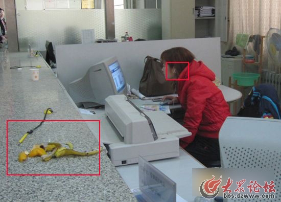 上午9時左右,記者來到梁山縣審批中心,看到一沓“金紙”放在桌邊,兩個女同志正圍在一張桌子忙著疊“金元寶”。隨后記者又發現逛論壇、偷菜成了三位工作人員手頭忙活的“網絡工作”,在一位工作人員的前臺放筆處堆了一堆橘子皮和香蕉皮也無人清理。