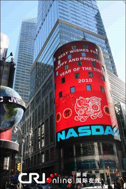 2010年春節(jié)期間,美國(guó)紐約時(shí)代廣場(chǎng)上,納斯達(dá)克總部大樓外的大屏幕打出了恭賀中國(guó)新春的圖案和中英文字樣。